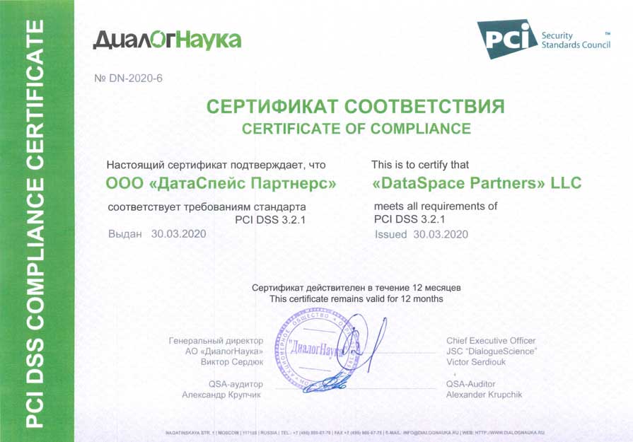 - Аудит инфраструктуры ЦОД DataSpace, проводившийся в рамках сертификации PCI DSS 4.0, подтвердил наличие всех необходимых мер, средств и процессов, отвечающих в полной мере требованиям стандарта.
